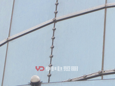 2、幕墻內(nèi)透安裝:有些幕墻玻璃顏色不深、透明性好,可以考慮將光源安裝在幕墻的內(nèi)側(cè),這種方式不會對幕墻造成任何外觀上的變化,白天隱形效果好;幕墻內(nèi)側(cè)安裝,可以用拉鋼絲繩的方式,二次封裝LED點光源設(shè)計有鋼絲卡扣,拉好鋼絲直接定好位置扣上去即可,方便快捷,不影響采光。