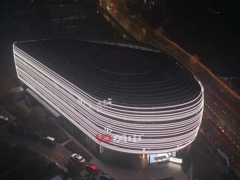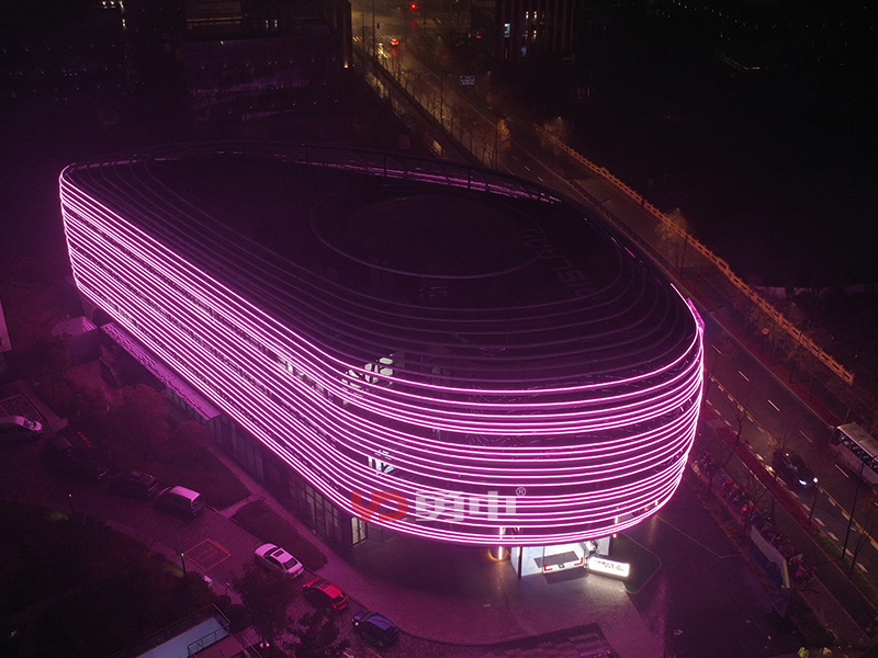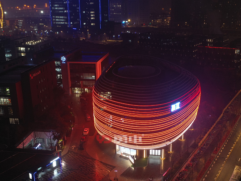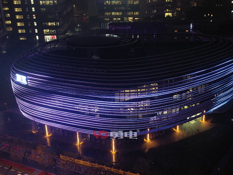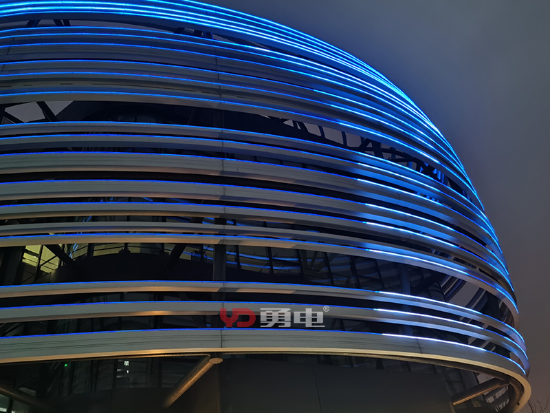 該項目照明主體為張江人工智能展廳,樓體外型充滿未來科技感,建筑樓高23米,樓周長185米,采用勇電二次封裝LED線條燈,用線強調(diào)建筑的輪廓,將環(huán)形立面刻畫出新形態(tài),豐富建筑肌理,讓建筑在夜間充滿活力!