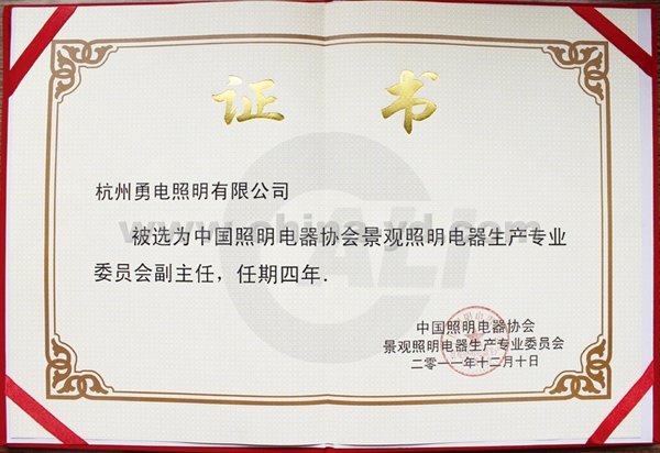我司于中國照明電器協(xié)會(huì)第一屆第一次會(huì)員大會(huì)中,被選為中國照明電器協(xié)會(huì)景觀照明電器生產(chǎn)專業(yè)委員會(huì)副主任,任期四年,特發(fā)此證。