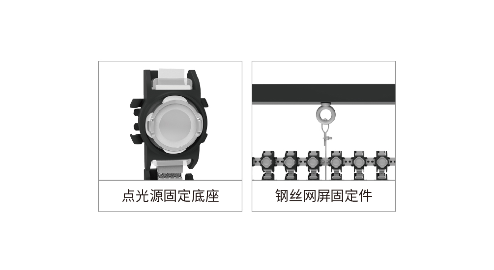 1、使用不銹鋼絲網(wǎng)作為光源固定。 2、采用二次封裝點(diǎn)光源配合塑膠固定件安裝。 3、易安裝、運(yùn)維、運(yùn)輸。