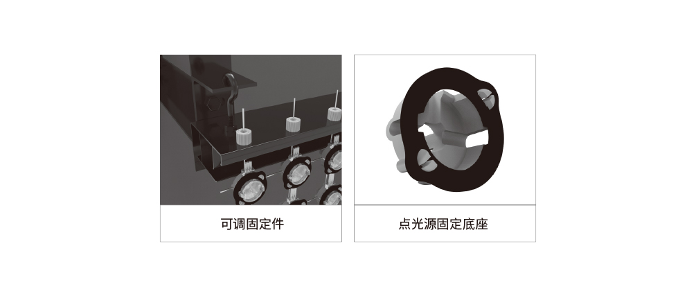 1、使用不銹鋼絲網(wǎng)作為光源固定。 2、采用二次封裝點(diǎn)光源配合塑膠固定件安裝。 3、易安裝、運(yùn)維、運(yùn)輸。